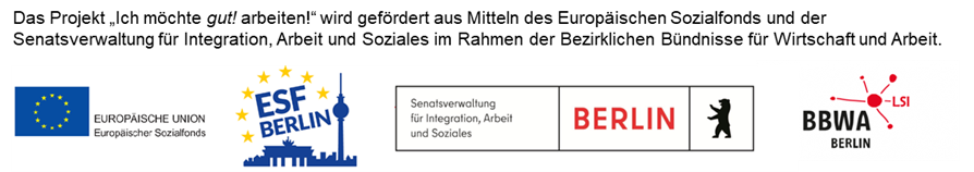 Bei unserem Projekt „ich möchte gut! arbeiten“ handelt es sich um ein Mikroprojekt des Förderinstruments Lokal-Sozial-Innovativ (LSI) der Förderperiode 2021-2027 des Europäischen Sozialfonds Plus (ESF+) und der für Arbeit zuständigen Senatsverwaltung. Fokus ist hier die lokale Förderung sozialer Integration und Innovation. Die Förderung unseres Projektes dient der sozialen Integration von Menschen, die von Armut und sozialer Ausgrenzung und Benachteiligung bedroht sind. Dabei sollen spezifische Herausforderungen berücksichtigt und Handlungsmöglichkeiten in den Berliner Bezirken erschlossen und genutzt werden.